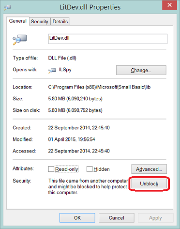 If the extension commands fail to appear in Small Basic (type LD and no options appear) then you may need to unblock the downloaded dll. Right click LitDev.dll and select Properties and clear the block if present. If it fails to unblock, then copy LitDev.dll to a folder where you have write access (e.g. Documents), unblock it there and then move back to the Small Basic lib folder. Alternatively, unblock the downloaded zip file before unzipping the content.